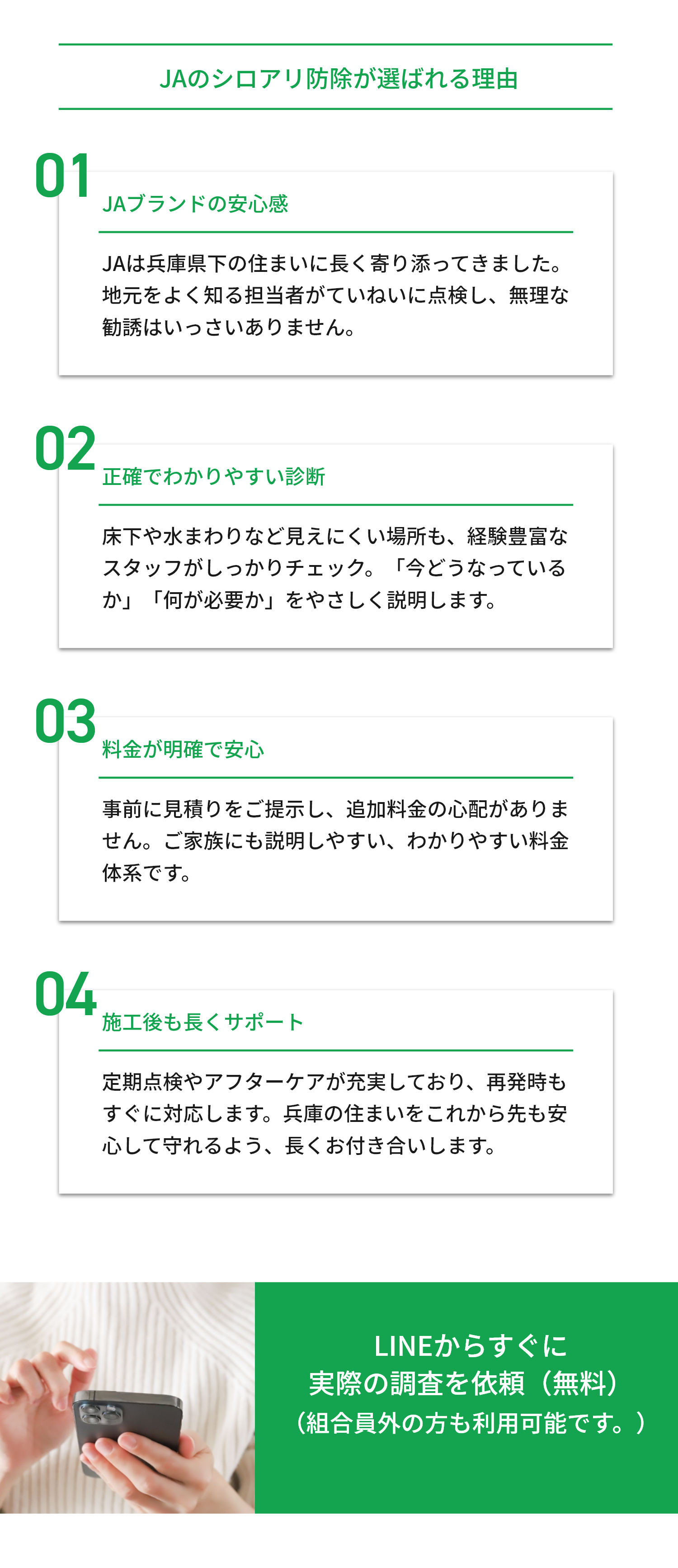 Q LINEで診断って、具体的にどんなことをするんですか? はい、LINEお友だち登録後いくつかの簡単な2択の 質問にタップでお答えいただくだけで、被害の可能性を 診断する仕組みです。 面倒な手続きや訪問は一切ありません。 Q 無料と聞いたけど、本当に料金はかかりませんか? ご安心ください。LINE診断・相談・現地調査は 完全無料です。調査の結果、有償にて 防除処理等をお勧めする場合がございます。 無理な営業や契約は一切ございません。 Q まだ被害が出ていない気がするのですが、それでも診断してもいいんですか? もちろんです! 予防の段階で診断を受ける方が増えています。 特に被害の出ていない住宅でも、“念のため”の チェックが大切です。 Q LINEのやり取りが苦手です。ほかの方法でも相談できますか? ご不安な方には、お電話やメールでの対応も可能です。 お気軽にご相談ください。 Q 兵庫県に住んでいますが、うちの地域も対応していますか? はい、JA全農兵庫の無料現地調査は兵庫県内全域を 対象としています。(組合員外の方も利用可能です。) まずはお気軽にお問い合わせください