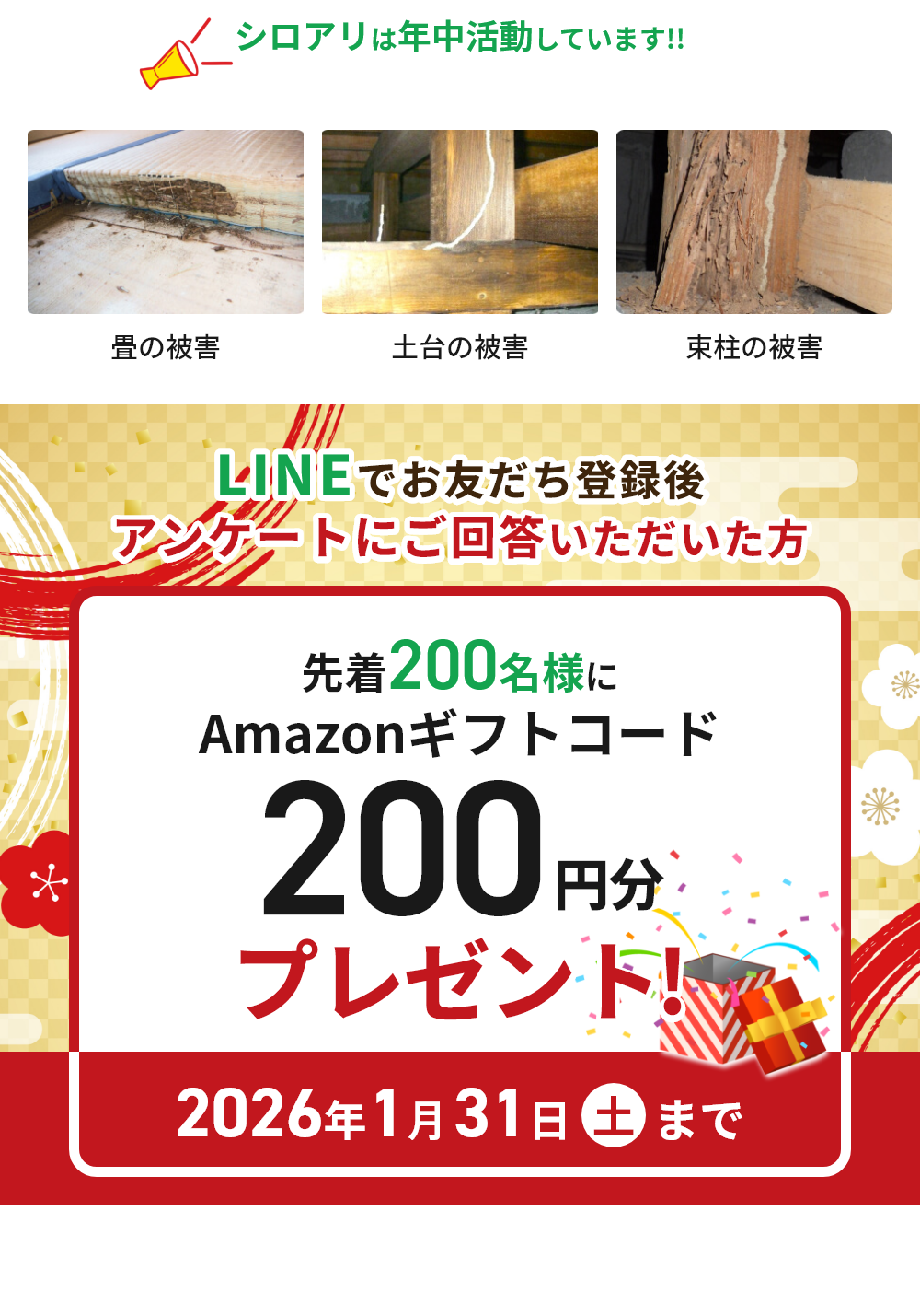 Q LINEで診断って、具体的にどんなことをするんですか? はい、LINEお友だち登録後いくつかの簡単な2択の 質問にタップでお答えいただくだけで、被害の可能性を 診断する仕組みです。 面倒な手続きや訪問は一切ありません。 Q 無料と聞いたけど、本当に料金はかかりませんか? ご安心ください。LINE診断・相談・現地調査は 完全無料です。調査の結果、有償にて 防除処理等をお勧めする場合がございます。 無理な営業や契約は一切ございません。 Q まだ被害が出ていない気がするのですが、それでも診断してもいいんですか? もちろんです! 予防の段階で診断を受ける方が増えています。 特に被害の出ていない住宅でも、“念のため”の チェックが大切です。 Q LINEのやり取りが苦手です。ほかの方法でも相談できますか? ご不安な方には、お電話やメールでの対応も可能です。 お気軽にご相談ください。 Q 兵庫県に住んでいますが、うちの地域も対応していますか? はい、JA全農兵庫の無料現地調査は兵庫県内全域を 対象としています。(組合員外の方も利用可能です。) まずはお気軽にお問い合わせください